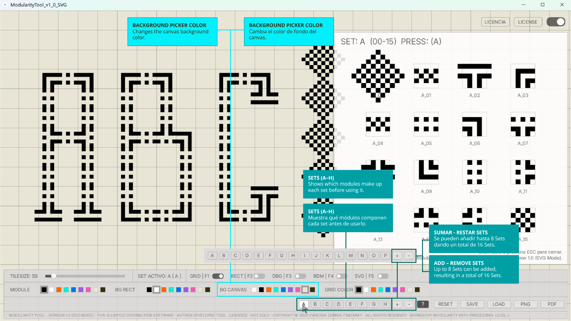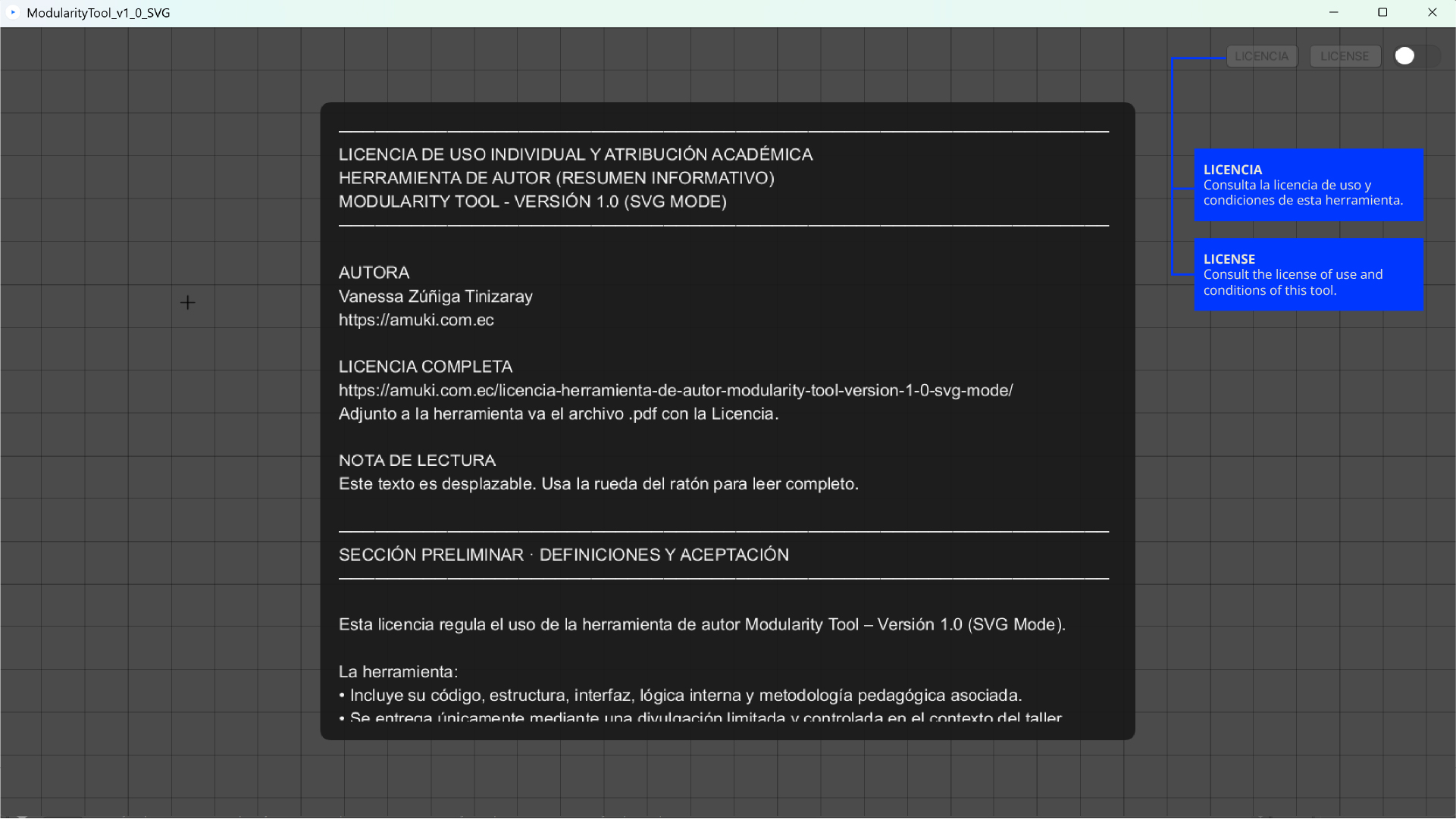 La herramienta de autor Modularity Tool — versión 1.0 (SVG Mode), entregada exclusivamente en el contexto del Taller de Modularidad con Processing — Nivel I, cuenta con una licencia de uso individual, personal y no transferible, desarrollada por la autora como parte de su investigación y práctica docente.