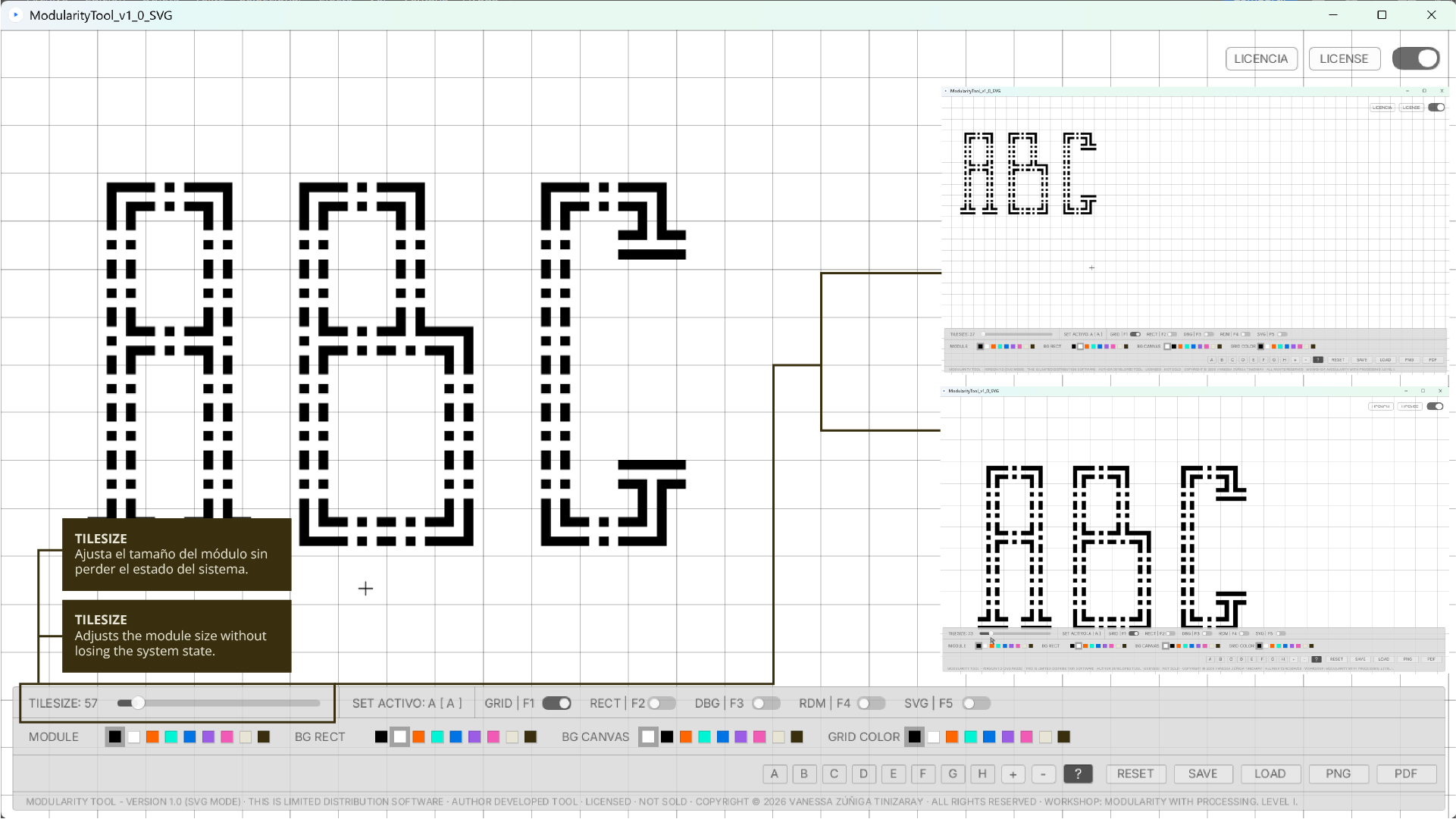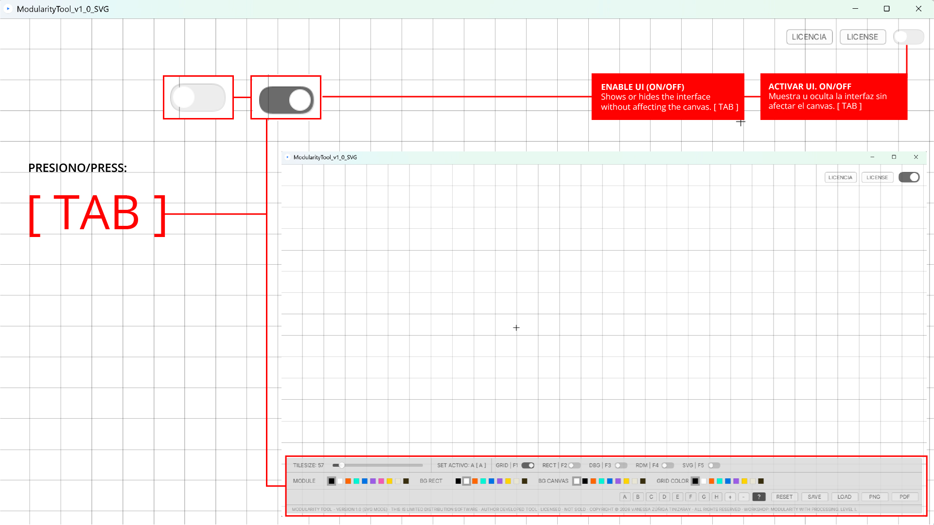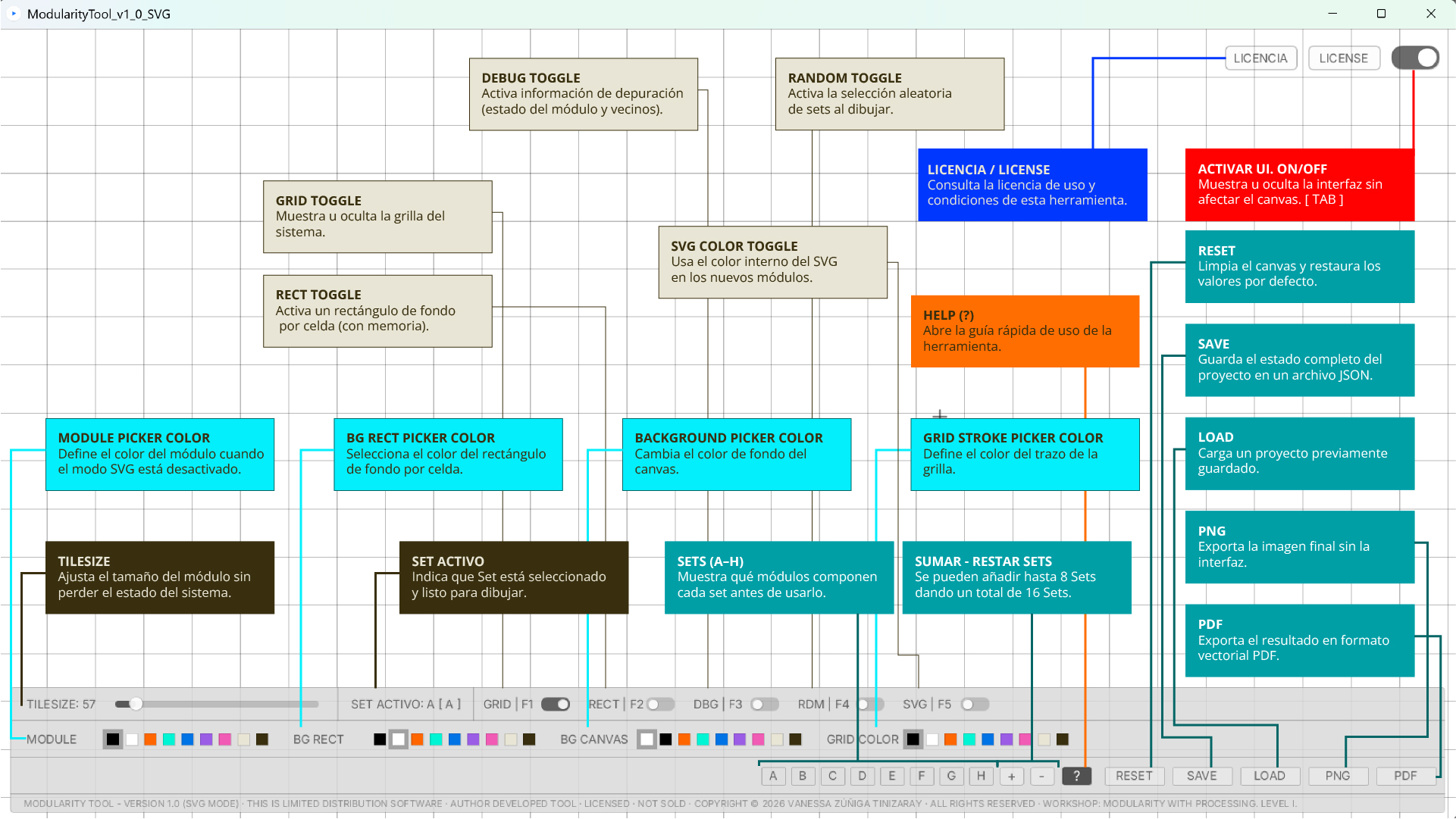 La herramienta de autor Modularity Tool — versión 1.0 (SVG Mode), entregada exclusivamente en el contexto del Taller de Modularidad con Processing — Nivel I, cuenta con una licencia de uso individual, personal y no transferible, desarrollada por la autora como parte de su investigación y práctica docente.